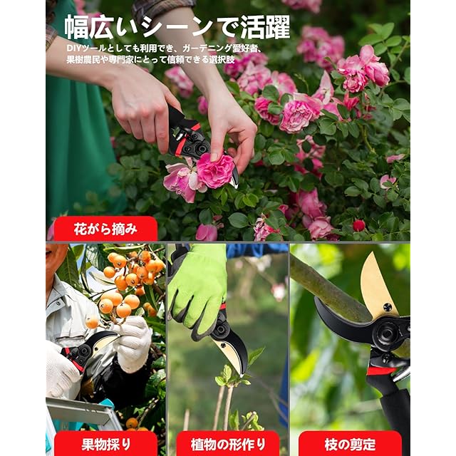 「多用途に使える優れた製品」剪定ばさみは、庭木の整枝だけでなく、果物の収穫や草花の手入れ、さらにはボタニカルアートの制作にも役立ちます。さまざまなシーンで活躍するため、家庭菜園やガーデニング愛好者にとって必需品となるでしょう。この多機能性が、さまざまな園芸活動をサポートします。