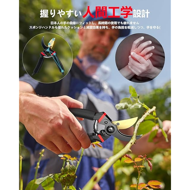 「細かい作業にも対応可能」刃の開き具合は調整可能で、繊細な作業にも対応できます。手が小さい方でも無理なく調整できるストッパーが付いているため、細かい枝の剪定や、力を入れずに軽い切断が可能です。さらに、バネの力で自動的に開く設計が施されており、作業中にストレスを感じることはありません。剪定の途中で手が疲れることなく、スムーズに作業を進めることができます。