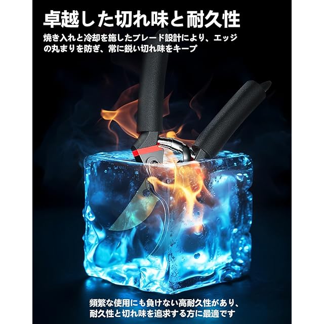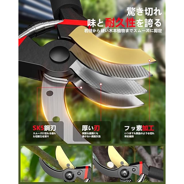 「高性能な刃で抜群の切れ味」硬度と耐久性に優れたSK85鋼を使用しており、切れ味が長持ちします。細い枝から最大30mmの太い枝まで、サクサクと切れる性能を実現しており、庭木や果樹の手入れに最適です。さらに、フッ素コーティングが施されているため、ヤニや樹液が付きにくく、錆びにくいのでお手入れが簡単です。この一つで、庭の手入れが効率よく進みます。