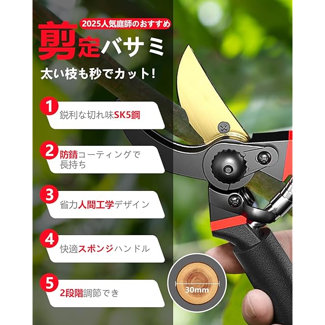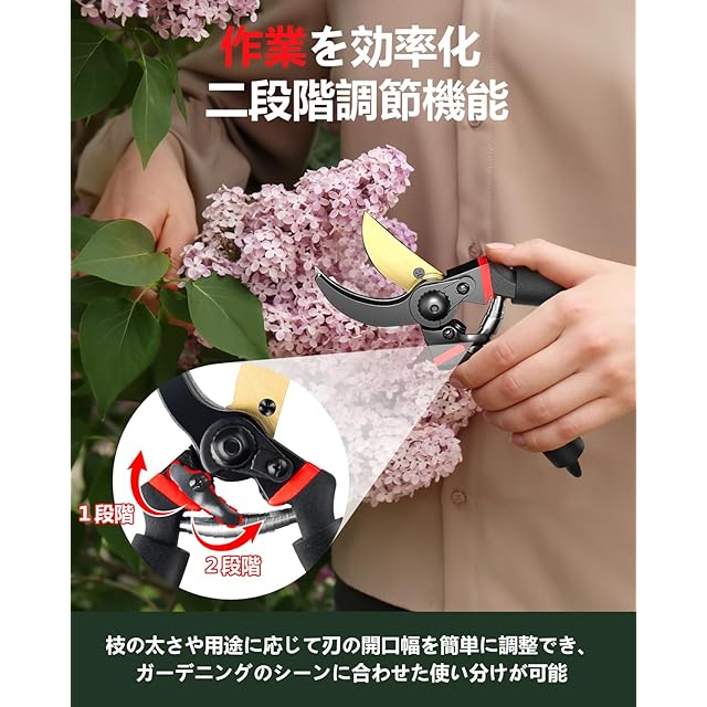 剪定ばさみ 【2025人気庭師のおすすめ】 剪定バサミ 剪定鋏 切れ味 2段階調節可能 SK85高炭素鋼刃 フッ素コーティング 錆びにくい 握りやすい 枝切りバサミ 園芸ハサミ 園芸用はさみ 錆びにくい 軽量化アルミハンドル 果樹 庭木 盆栽 庭園作業 ガーデニング 観葉植物 園芸用品