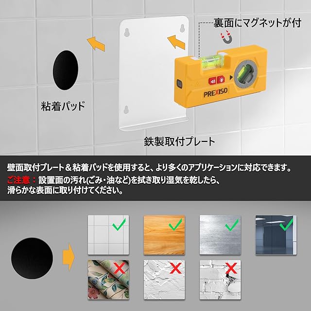 【壁面取付プレート&粘着パッド付】壁面取付プレート&粘着パッドを使用すると、より多くのアプリケーションに対応できます。ご注意:プレートの設置面の汚れ(ごみ・油など)を拭き取り、湿気を乾したら、滑らかな表面に取り付けてください。