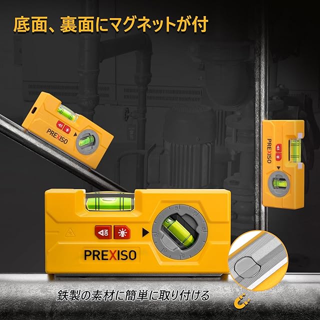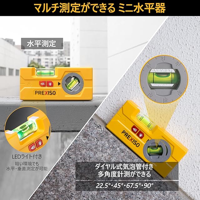 PREXISO ミニレベル ミニ水平器 レーザー水平器 ミニレーザーレベル 水準器 水平気泡管 ダイヤル式気泡管 傾斜計 22.5°45°67.5°90°角度計測 120mm コンパクト マグネット ライト 鉄製壁掛け板 粘着性ジェルパッド付き | つむぎ屋
