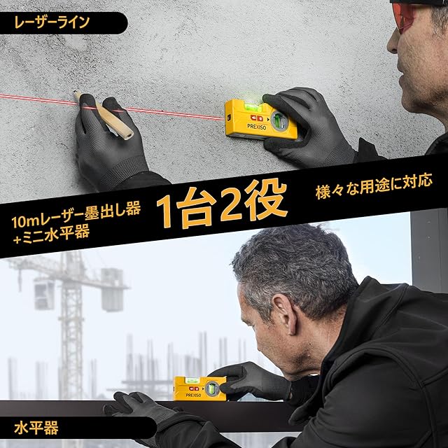 【1台2役】さまざまなニーズに対応できます。10mのライン照射が可能で、水平気泡管とダイヤル式気泡管を使って水平や垂直を確認できます。またはLEDライト付いて、暗い環境でも使用可能です。レーザーが室外には向いていません。