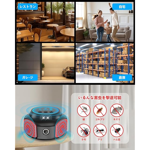商品名:【2025 アップグレード版】ネズミ 駆除 動物撃退器静音 ゴキブリ蚊ゴキプリなど PIRセンサー 360°スピーカー強力 静音 電磁波種類超音波+圧力波+常夜灯高性能 静音無毒 省エネ 屋根裏/倉庫/台所/寝室/屋外用 子供やペットに安心日本語説明書(ブラック)