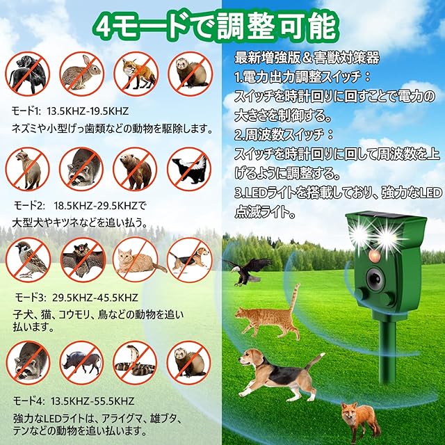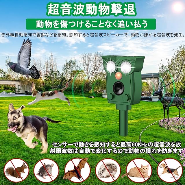 超音波・警報音・LEDライトで動物を撃退:本動物撃退器は超音波・警報音・強力LEDフラッシュライトの3つの組み合わせで動物を撃退できます。本製品は、広範囲に効果的な超音波(13.5~55.5kHz)とLEDフラッシュを組み合わせた害獣撃退器です。様々な種類の動物に対応しており、効果的に撃退することができます。LEDライトを搭載。超音波の特定の周波数に適応してしまい受けにくくなる有害動物も、強力なLED点滅ライトと組み合わせることで効果的に追い払います。また、感度調整のダイヤルもあり、使用状況に応じて調整可能です。動物愛護の観点から作られた撃退器です。人と動物に無害ですが、室外に置くことをおすすめいたします。