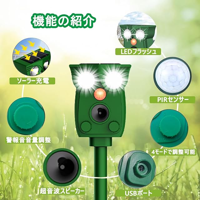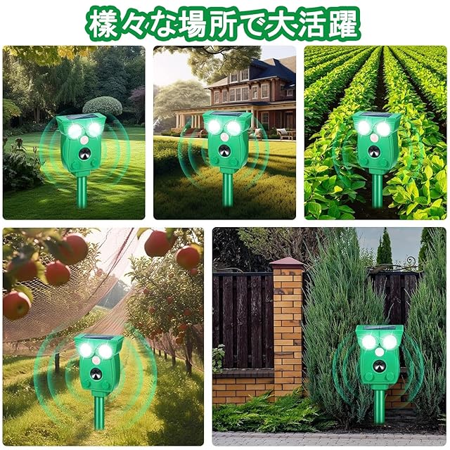 動物撃退器 猫よけ【2025年最新モデル】超音波+LEDフラッシュ+警報音 3WAY駆除 ネズミ・猫・鳥・モグラ撃退機 IP68防水 ソーラー/USB充電 3000mAh大容量 赤外線センサー(120° 12m) 5段階調節 日本語説明書付 庭/畑/駐車場用 1. 赤外線センサーで自動感知&スマート撃退 最新の赤外線センサーが害獣を自動検知し、超音波(13.5~55.5kHz自動可変)で即時対応。動物が慣れないよう周波数を自動変更するため、持続的な効果が期待できます。LEDフラッシュと連動し、より確実に追い払います。 2. 広範囲カバー(120°角度・最大12m感知) 従来製品より広い検知範囲(水平120°/垂直55°)を実現。5段階の感度調整で、庭・畑・駐車場など、設置場所に合わせて最適な設定が可能です。 3. 超音波+LEDストロボ+警報音のトリプル対策** - **超音波**:ネズミ、猫、モグラなどに効果的 - **強力LEDフラッシュ(800ルーメン)**:夜行性動物にも有効 - **85dB警報音**:鳥やアライグマなど音に敏感な動物を威嚇 。 4. ソーラー&USB充電で電源不要** **3000mAh大容量バッテリー**を搭載し、フル充電で約1ヶ月連続使用可能。雨天でも安心の**IP68防水防塵**仕様で、屋外での使用に最適です。 5. 簡単設置&自動運転** 付属の杭で地面に挿すか、壁掛け可能。明るさセンサー内蔵で、暗くなると自動作動し、朝には自動停止。**日本語説明書付き**で、面倒な設定は不要です。 対応動物: ネズミ、猫、犬、モグラ、鳥、キツネ、アライグマ、イノシシ、イタチ、コウモリなど ・アフターサービス: ✅ **30日間返品** ✅ **1年間メーカー** 万が一不具合があれば、24時間以内にご対応いたします。 ご注意: - 台風や豪雨時は屋内保管を推奨します。 - ペット(犬・猫)によっては反応する場合があります。設置位置にご注意ください。 この動物撃退器があれば、糞尿・食害・騒音のストレスから解放されます!