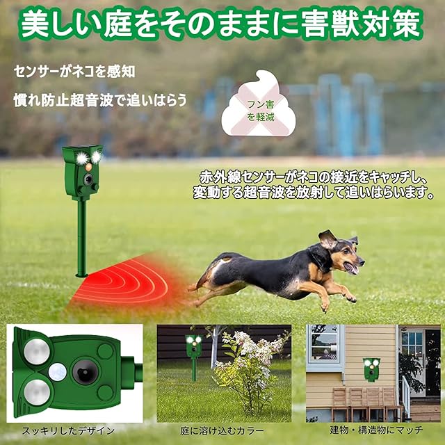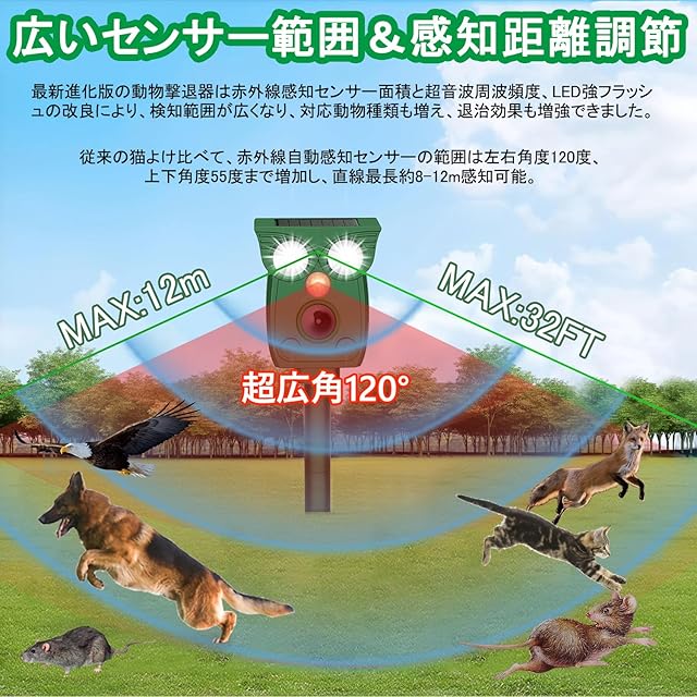 広い感知エリア&感知距離調節:従来の猫よけ比べて、赤外線自動センサーの感知範囲は、平面角度約120°、上下角度約55°、直線最長約8-12m感知可能。5つの撃退モードで、実際の使用範囲に合わせて感知距離と超音波の強みを調節できます。ストレスなく花壇・庭・駐車場など色々な場所で活躍できます。コンパクトで目立ちませんし、景観を壊しません。ネズミ、犬、猫、モグラ、鳥、キツネ、ドブネズミ、コウモリ、アライグマ、イノシシ、イタチなどの動物が撃退できます。静かに近づく夜行性動物も逃さず撃退します。わずか3週間ほどで動物の糞尿、騒音、食害、足跡などの悩みから解放されます。