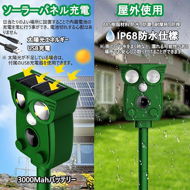 2つの充電方法&IP68防水防塵:ソーラーパネル式の充電方法の搭載により、日中は太陽光でバッテリーを自動的に充電します。基本的に外に置くだけで害獣を撃退してくれます。3000Mahバッテリーを内蔵、電池交換不要、超長時間作動できます。曇りや雨の日があっても、USBケーブルで充電できます。2~3時間で充電完了、一回フル充電で1ヶ月ほど使用可能です。筐体は高強度のABSとシーリング構造を採用し、IP68相当の防水・防塵性能を実現しています。IP68レベルの防水効果を備え、梅雨など連日の雨の日でも、鳥よけや猫除け対策としてご利用いただけます。(長くお使いいただくために、台風や大雨などの悪天候の際には屋内保管推奨。)
