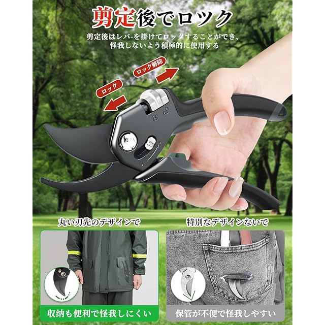 【安全ロック付き】当社の庭鋏は内蔵スプリング設計を採用しており、スプリングの脱落や剪断破壊の発生を効果的に防ぎます。安全ロックは、使用していないときにハサミが誤って開くのを効果的に防ぎ、安全を保護します。ロック設計は、怪我を避けるためにはさみを保管するのにも役立ちます。