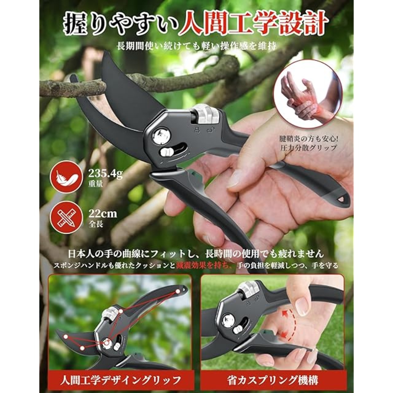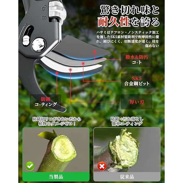 【錆びにくく切れ味長持ち】 庭木や果樹の剪定に大変便利な剪定鋏です。刃は剪定鋏の重要な部分で、硬度と靭性を兼ね備えたSK85(SK5)鋼を使用しています。ブレードは高周波焼入れにより、硬度と靭性を兼ね備えています。 ハンドルには少量のアルミニウム合金を使用し、耐久性を確保。チタン・メッキにより、魅力的で錆びにくく、お手入れのしやすい仕上がりになっています。