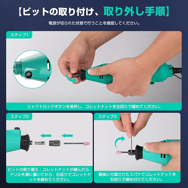【高品質純銅モーター&透明保護カバー搭載】このミニルーター工具高品質の銅芯モーターを采用し、粗銅線を巻き取り、高周波数と均一性によりパワーと作業効率に优れ、安定性が高く、耐熱构造となっています。また、リューターの本体には、過熱を避けるための放熱孔が複数設けられている。また、当店はこの制品のために特別に透明なシールドを備えています。これは切断や研磨時に研磨した粉などの影响からあなたを保護します。