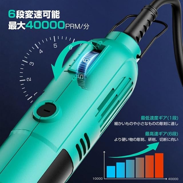 【6段変速10000RPM ~ 40000RPM】このミニルーターは1 ~ 6段変速ギアを備えています。最大40000RPMまで回転します。木材、ガラス、金属、プラスチック、ジェイドなど様々な材料に、制品や用途に応じた回転速度を選択して細かく彫ることができます。