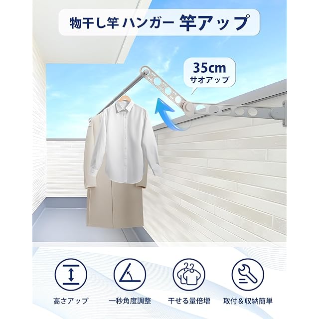4.【竿アップ35㎝】:長い衣類を干す場合、よく床について汚れます。本製品を取付後、丈が長い洗濯物の高さを最大35cm高くすることができ、2本竿を通せば、乾燥スペース不足の問題を効果的に解決し、布団も干せ、外干しの悩みがスッキリ解決!