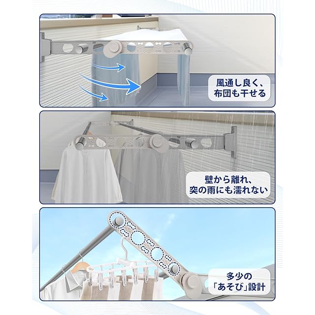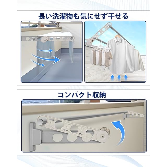 6.【設置簡単&畳み収納可能】:日本語取扱説明書が付属しており、ネジを回すだけで一人でも簡単に取り付ける、使用しない場合は、そのアームを折りたたみ、コンパクトに収納可能、ベランダのスペースを占いません。ご注意:本製品を装着する前、ぜひ注意事項を読んでください。また何の不備がありましたら、こちらにご連絡ください。弊社はできるだけ対応させていただきます。