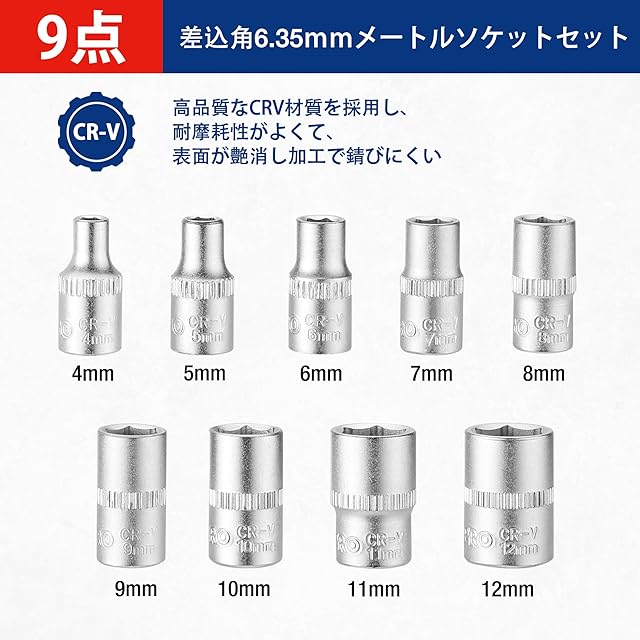 【セット内容】統計34PCのソケットレンチセットです。差込角6.35mmソケット×9pc(サイズ:4, 5, 6, 7, 8, 9, 10, 11, 12mm)、両用ヘッドラチェットレンチ×1pc(差込角6.35mm)、ユニバーサルジョイント×1pc(差込角6.35mm)、50mmエクステンションバー×1pc(差込角6.35mm)、100mmエクステンションバー×1pc(差込角6.35mm)、マグネティックビットドライバー×1pc(差込角6.35mm)、ドライバービット×20pc(差込角6.35mm)。