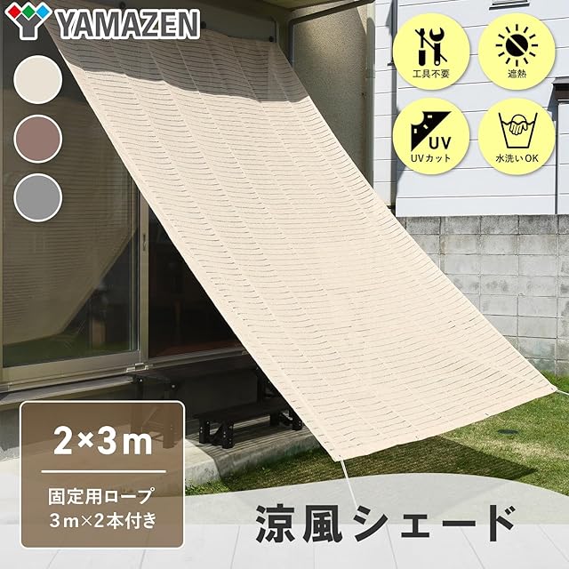 山善(YAMAZEN) 日よけシェード 200×300㎝ 水洗い可能 ハトメ8箇所 UVカット率約70% 取付ロープ3m×2本入り 節電 省エネ ベランダ 紫外線カット 防水 涼風 アイボリー BRGS-2030