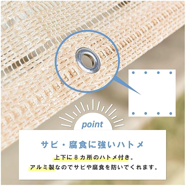 【特徴】日よけや目隠しとして使えるガーデンシェードです。外から入りこんでくる直射日光をやさしく和らげ、室内の温度上昇を緩和し、節電効果も期待できます。水洗いが可能なので汚れた場合も安心です。縦にも横にも使用できるハトメ8個タイプです。