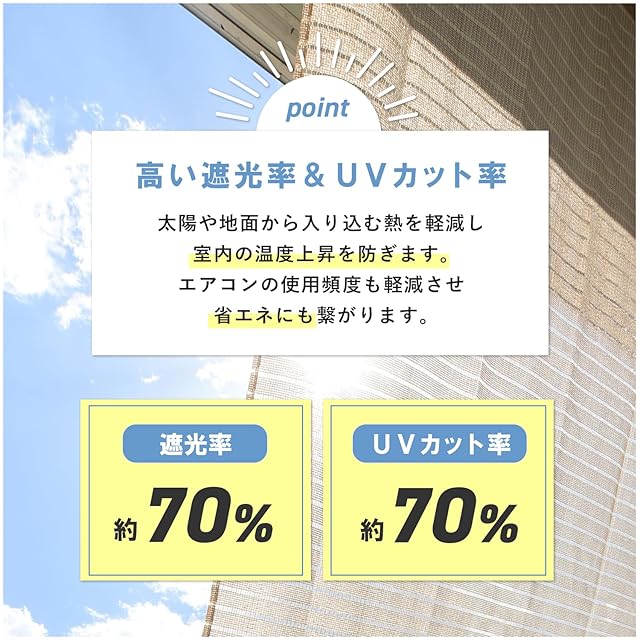 【仕様】サイズ:200×300㎝/商品重量:800g/材質:ポリエチレン/UVカット率:70%/遮光率:75%/カラー:涼風ブラウン