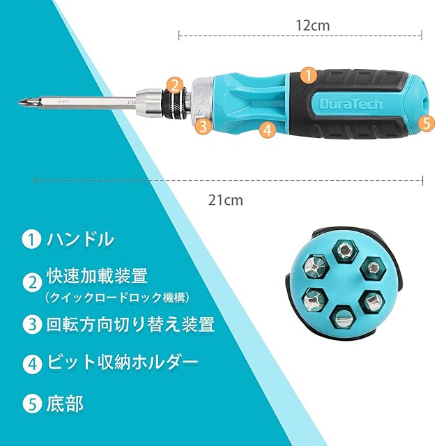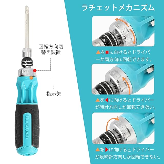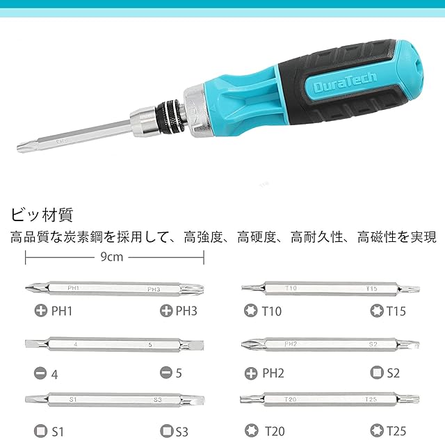 商品名:DURATECH ドライバー 差替ドライバー ドライバーセット 12-IN-1 クイックリリースボールグリップ プラス マイナス トルクス スクエア ラチェットドライバービット 6本付 家具組立 メンテナンス 車載修理工具