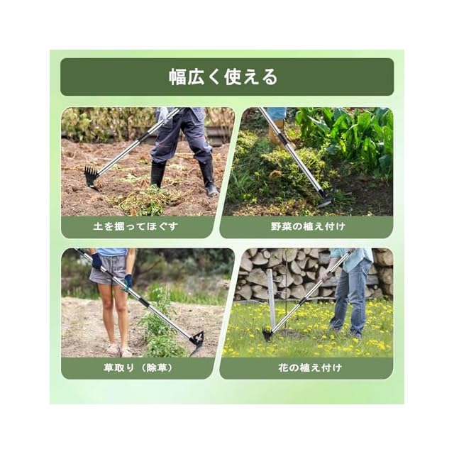 ④【様々な作業に対応】 草取り、草むしり、雑草抜きはもちろん、土の耕しや小面積の整地、鍬としての使用も可能。庭、畑、芝生、ベランダ、駐車場、家庭菜園など、あらゆるシーンで活躍します。雑草取り 根こそぎタイプとして「草刈りツール」や「くわ」などをお探しの方にも最適。