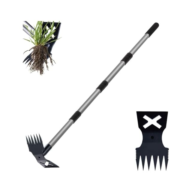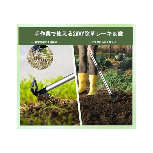 ①【2WAY除草ツール】 この草取り道具は、2つの機能を備えた画期的な雑草取り器具です。6本の鋭い爪で土の奥深くまでしっかりと差し込み、根こそぎ雑草を抜き取ります。また、反対側の平らなエッジは、草削りや小面積の土ならし、草刈りにも最適です。草刈りレーキとしても活躍し、1台で多用途に使える便利グッズです。