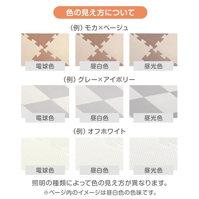 ・表面の凹凸の深さに若干の個体差がある場合がございます。 ・ロットによって色味が異なる場合がございます。 ・床暖房の種類等によって、商品に多少の反りが生じる場合がございます。 ・PE素材の特性上、使用するうちに負荷がかかる部分に多少のへたりが生じます。 そのため、既に使用しているマットに新しいマットを繋げて使用する際、上手く繋がらない場合もございますので、予めご了承ください。 2019年1月10日に素材をEVAからPEに変更しました ※床材(塩化ビニル・フローリング等)によって、色移りや変色が起こる場合がございます。床とマットの間に敷物や防護シートを敷いていただくことを推奨しております。