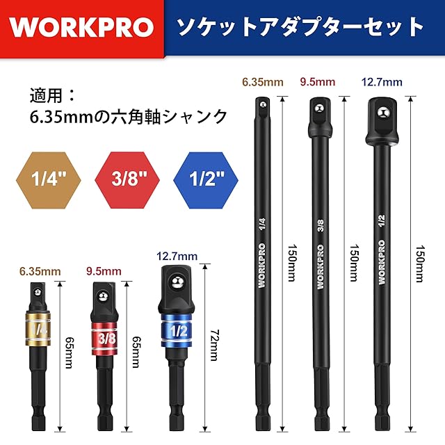 【豊富なセット内容】WORKPRO ソケットアダプター9本組です。ソケットアダプター【カラーアルミリング型】*3PC:差込角 6.35mm・9.5mm・12.7mm各1本(全長65mm&65mm&72mm)、ソケットアダプター*3PC【長型】:差込角 6.35mm・9.5mm・12.7mm 各1本(全長150mm)、ソケットアダプター*3PC【ユニバーサル型360°回転】:差込角 6.35mm・9.5mm・12.7mm 各1本(全長55mm&55mm&59mm)。適用:6.35mmの六角軸シャンク。