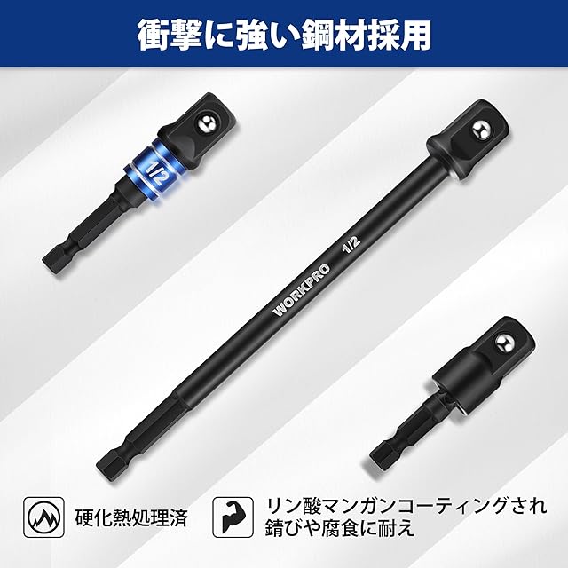 商品名:WORKPRO インパクトグレードソケットアダプター ソケットアダプター インパクト用 9本組 全長55~150mm ユニバーサル エクステンション 差込角6.35mm(1/4")・9.5mm(3/8")・12.7mm(1/2") 熱処理済み ドリル アクセサリー 電動ドライバー DIY 工具 車 タイヤ交換 自転車修理 収納ケース付き