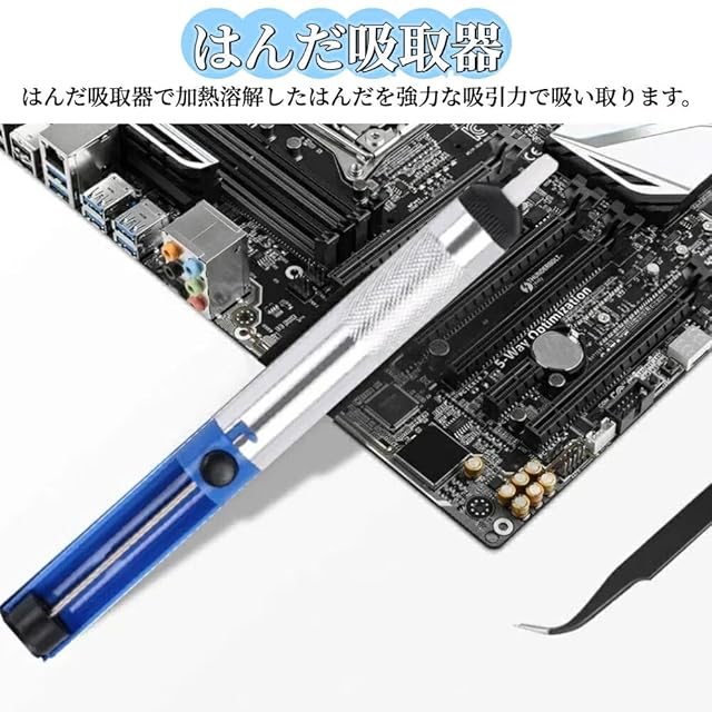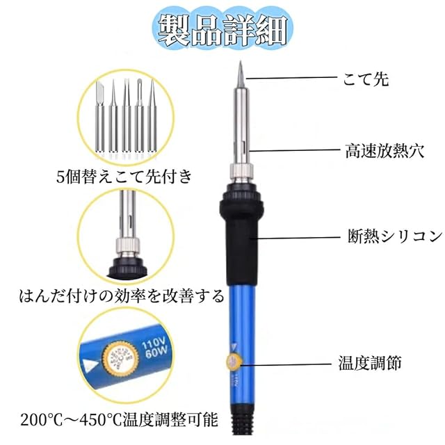 【パッケージ内容】 半田ごて本体 x1、半田ごてスタンド x1、半田ワイヤー x1、半田すいとり器 x1、電源ケーブル50cm 黒 x1、電源ケーブル50cm 赤 x1、簡易ワイヤーストリッパー x1、ピンセット x1、スポンジ x1、収納ケース x1、半田ごて替え先 x5。