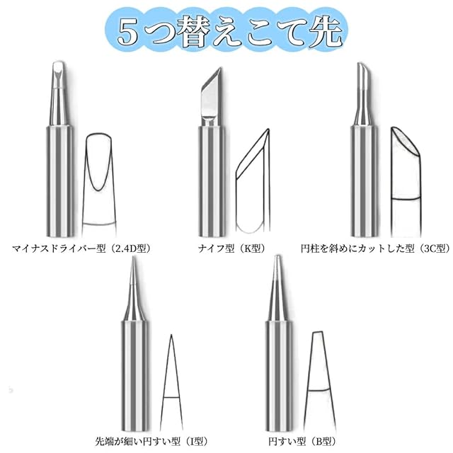 【5本交換可能な半田ごて先】 半田ごて先は先端角度と形状が異なり、ギター、時計、コンピューター、ハードウェア、テレビなどの様々なはんだ付けシナリオ向けに設計されています。ゴテ先の交換方法は、金属シースを緩め、元のゴテ先を外し、新しいのをセラミックコアの上に付けて金属シースを締めます。