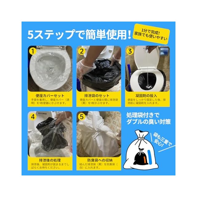 【豊富な付属品!】1箱セット内容 ◆凝固剤X50回分,手袋 X100枚(50組),便器力バ一(透明)x5,排泄袋(黑)x50 , 防臭袋(处理袋)(白)x5。