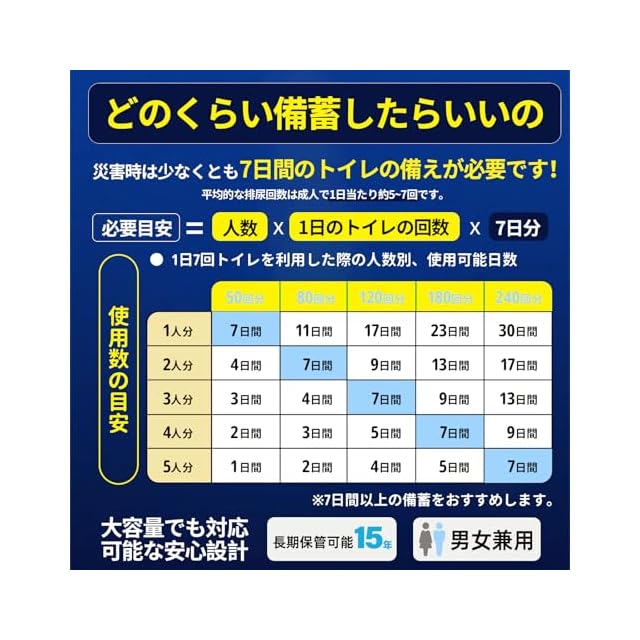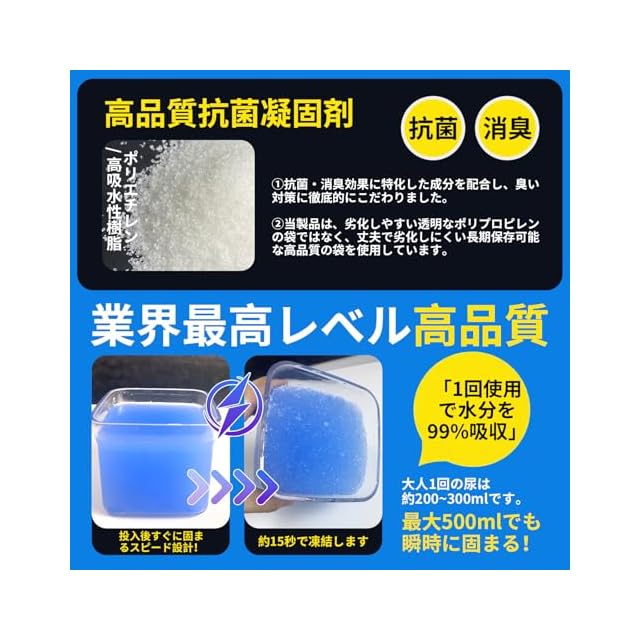 【優れた抗菌性・吸水・消臭性】多機能で高性能凝固剤を採用し、凝固剤1つで、500mlの水分を15秒内で吸収して固めます。優れた抗菌・消臭性能で、臭いの心配なし。細菌の増殖も効果的に抑えます。また、高品質のパッケージを使用し、15年の長期保管することができます。