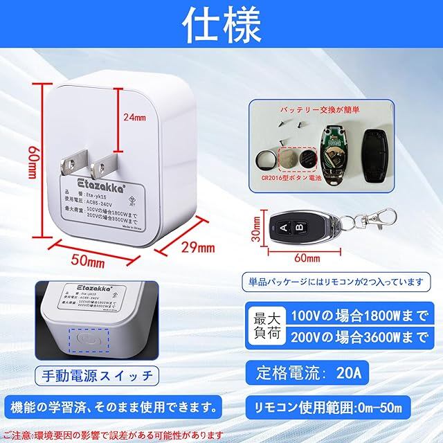 Etazakka リモートコントロールスイッチ リモコン電源 スマートリモコンコンセント 100V200V通用20A 50m長距離制御 WIFI不要 工事不要 2点リモコン付き (1個受信機+2点リモコン) | つむぎ屋