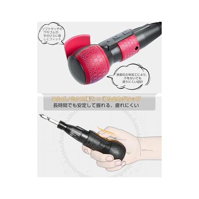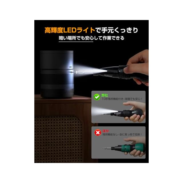 ✅【コンパクト・軽量・コードレス設計】手軽なサイズ感と軽量設計で長時間の作業も楽にできる電動ドライバーです。本体は約200gの軽量設計、女性にもストレスなく長時間使用できます。充電式コードレスタイプでどこでも気軽に作業できます。コンセントがない場所でも使えるうえ、作業中にコードが邪魔にならず取り回しが格段に優れています。