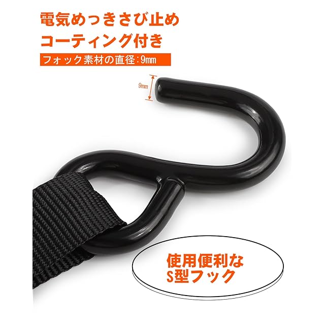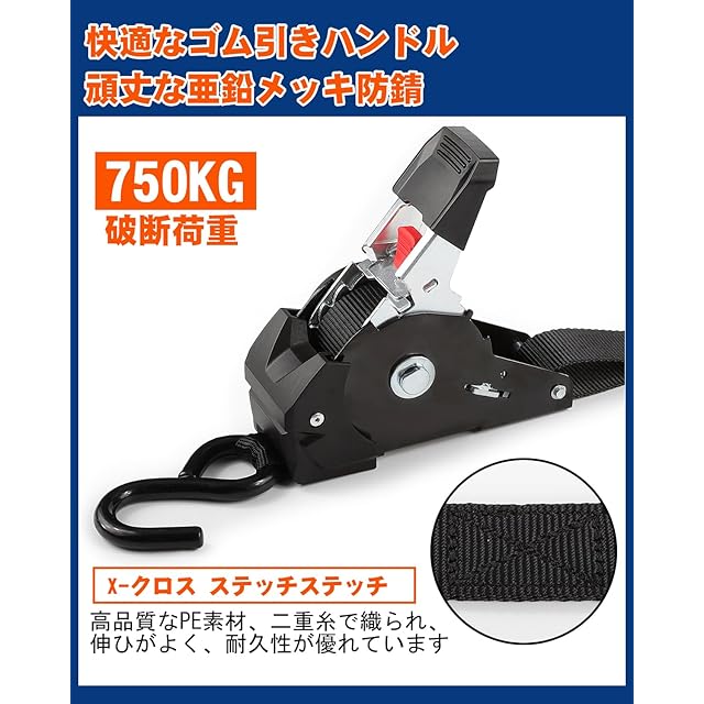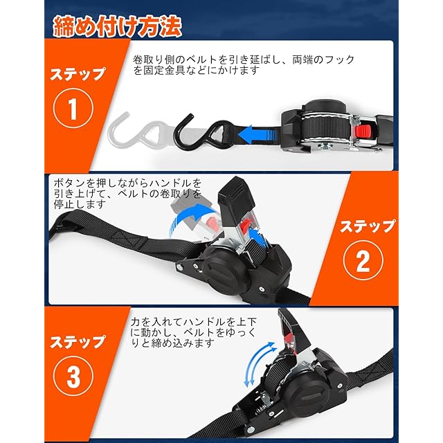 【ラチェット機能】荷締めベルトはラチェット機能付を搭載し、荷物をしっかり締め付けます。引き出すだけで長さを調節可能で、荷締め作業がスムーズかつ簡単です。