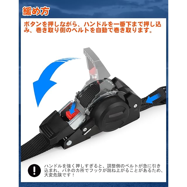 【自動巻き取り式】ボタンを一つクリックするだけで、余分な荷締めベルトの長さを簡単に引き戻せます。
