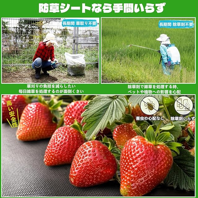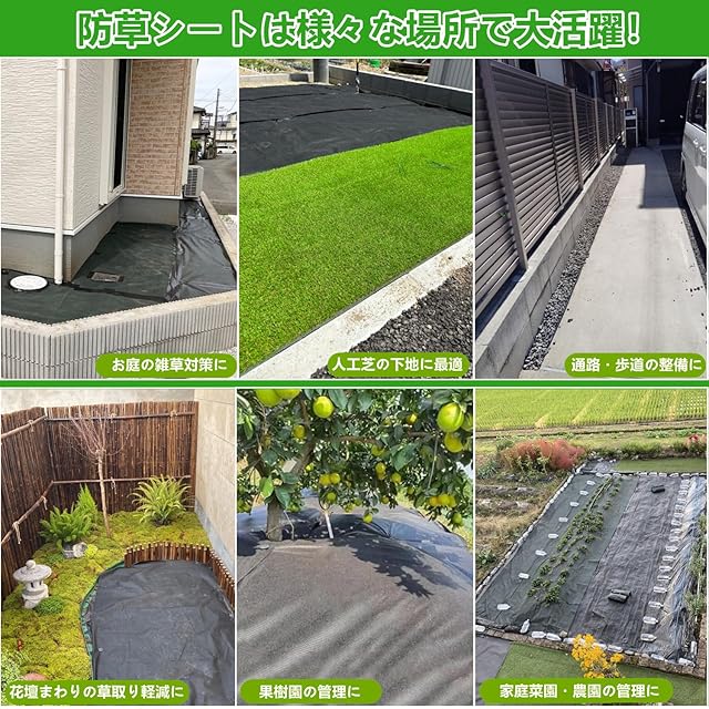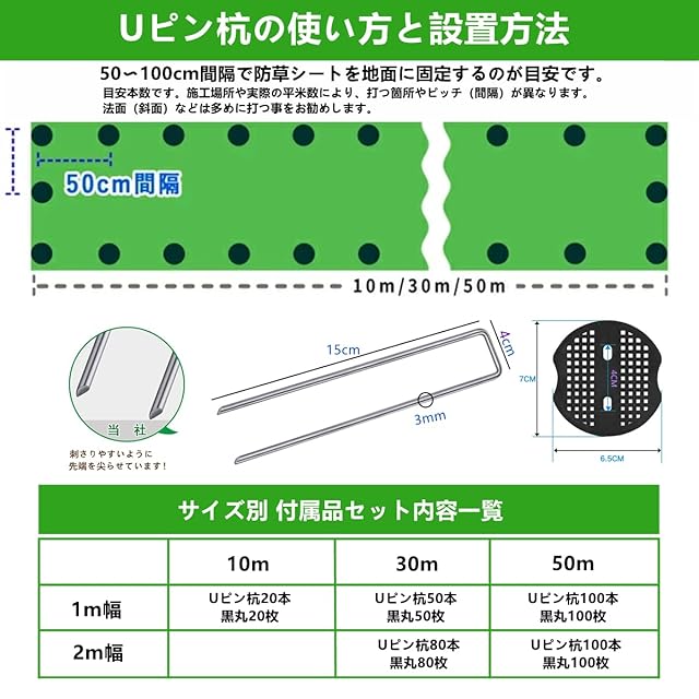 【防草シートのパッケージ詳細】 防草シートの材質:高密度不織布/両面使用可 防草シートのサイズ:2x50m(幅2mを幅1mに折り畳んだ状態,巻き物) 防草シートのセット内容:スチール製Uピン杭100本+黒丸100枚の合計200点セット(スチール製ピン杭の表面には亜鉛メッキ加工がされているため腐食や錆びが起こりにくいです。)【防草シートの適用場所】路肩、畑、菜園、果樹園、花壇、空き地、建物まわり(庭、通路、物干し場、ウッドデッキ下、人工芝下、砕石・砂利下、ガレージ、墓地(墓石まわり)などでご利用できます。