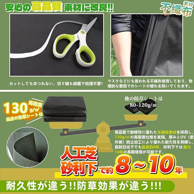 【強い耐久性】この防草シートは高密度(130g/㎡)で高品質な不織布で作られ、強度、耐引裂性ともに非常に高いです。使用環境(温度や日光や湿度)により異なりますが、最長使用可能年数は10年です。敷くだけで長期間雑草が生えるのを防ぎ、辛い草むしり作業が大幅に軽減できるので、雑草の処理にお困りの方におすすめです。また、UV剤入りなので、紫外線による劣化を防ぎます。大雨や猛暑にも強い商品です。