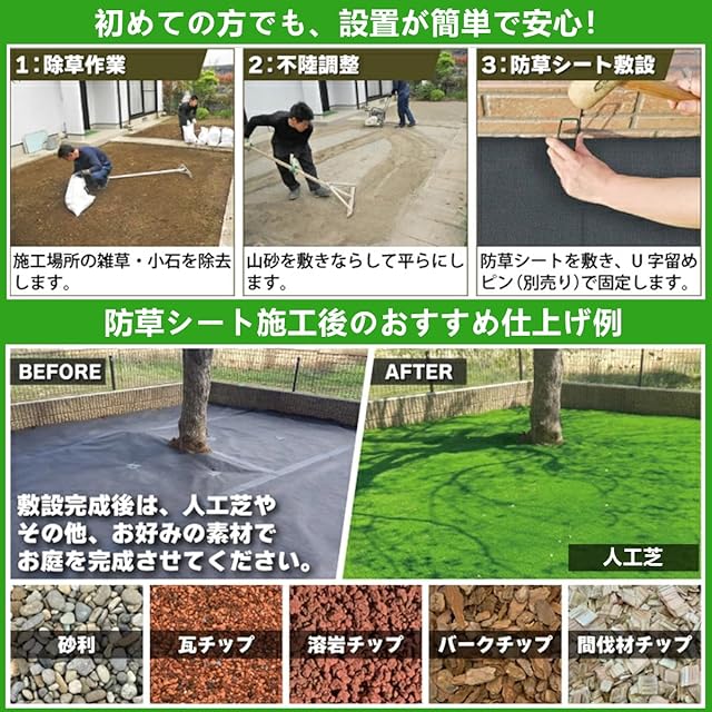 【防草シートのパッケージ詳細】防草シートの材質:高密度不織布/両面使用可 防草シートのサイズ:1x30m(巻き物) 防草シートのセット内容:スチール製Uピン杭50本+黒丸50枚の合計100点セット(スチール製ピン杭の表面には亜鉛メッキ加工がされているため腐食や錆びが起こりにくいです。)【防草シートの適用場所】路肩、畑、菜園、果樹園、花壇、空き地、建物まわり(庭、通路、物干し場、ウッドデッキ下、人工芝下、砕石・砂利下、ガレージ、墓地(墓石まわり)などでご利用できます。