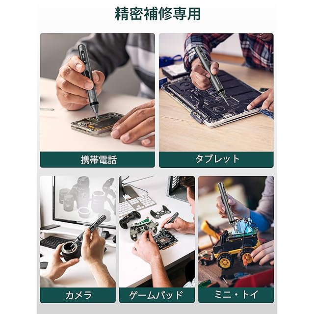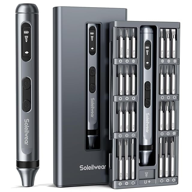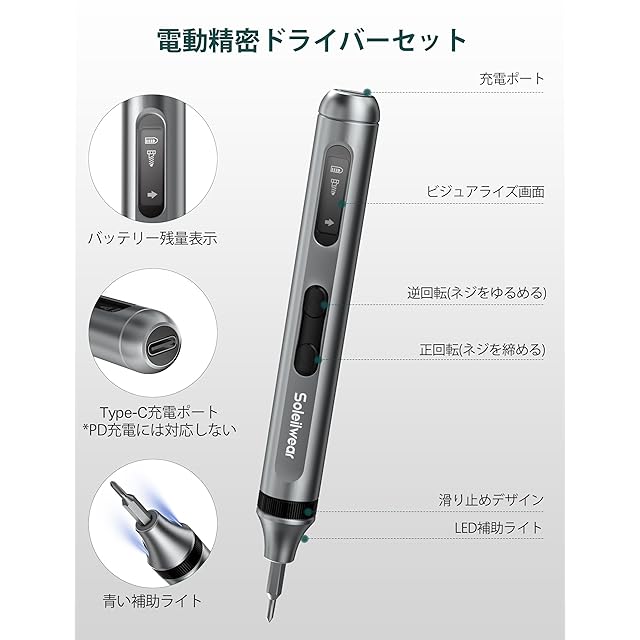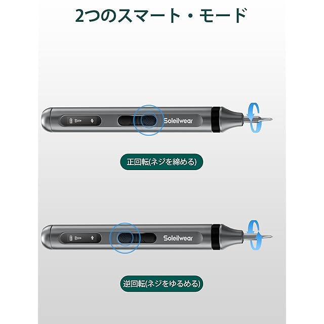 人間工学に基づいたデザイン:握りやすいコンパクトタイプで初心者や女性でも扱いやすいのが特徴です。Soleilwear小型電動ドライバーの形状はペンに近いです。ペン型ドライバーは円弧の表面デザインを採用し、滑りにくく、作業中に電動精密ドライバーをよりよくコントロールでき、グリップがより快適になります。収納専用ケースと電動ドライバーの両方が灰色のアルミニウム合金を採用しています。
