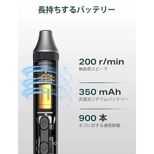 大容量バッテリー&高速充電: 350mAhの充電式リチウム電池を搭載し、Soleilwearの充電式電動ドライバーはわずか45分でフル充電できます。180分間の続使用と90日間のスタンバイが可能です。!USB-C PD充電器では充電できず、USB-AからUSB-Cへの充電にのみ対応しています。