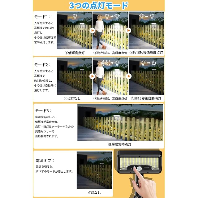【3つの感知モード・IP65防水】お客様の使用シーンや目的に応じて3つの感知モードを搭載したソーラーセンサーライトです。(1) 人感センサーモード: センサーが人や動きを感知した時だけ強力に15秒間点灯し、人が去ると微灯状態。防犯性と省エネ性を両立します。(2) 省エネモード: 周囲が暗い状態でのみ、人を感知すると明るく点灯(15秒間)、人が去ると消灯。最も省電力で、必要な時だけ確実に明かりを灯すスマートモードです。(3) 明暗センサーモード: 周囲が暗くなると自動的に点灯し、明るくなると消灯。感知機能はオフで、ほのかな明るさを一晩中提供し、庭や通路の安全なナビゲーションや雰囲気作りに最適です。さらに、IP65防水防塵仕様を取得。強い雨風やほこり、粉塵にも耐え、過酷な屋外環境でも確実に動作。梅雨の長雨や豪雪地域、水しぶきの多い駐車場など、日本の厳しい気候条件でも安心してお使いいただける耐久性を備えた ソーラーライトです。