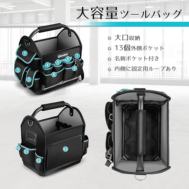 DURATECH ツールバッグ 多機能ツールバッグ 工具差し入れ 工具袋 工具入れ 900Dオックスフォード 調節可能な肩掛けベルト付き 鋼製ハンドル付き 多機能 大容量 整備工具 工具収納 電気工事 木工用 30.5 x 22 x 30 cm | つむぎ屋