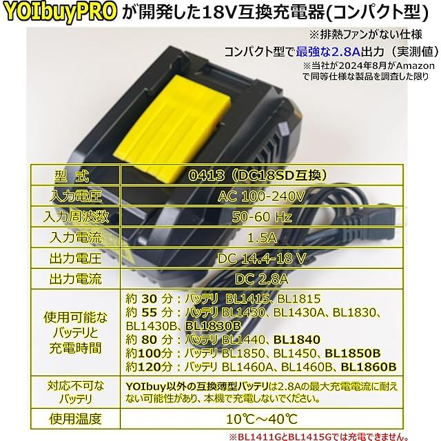 商品名:YOIbuy PRO 14.4V/ 18V 互換 充電器 MKT DC18SD 互換品 コンパクト 充電電流2.8A 手抜きなしの大きい基板採用 汎用性が高くバッテリーに優しく充電