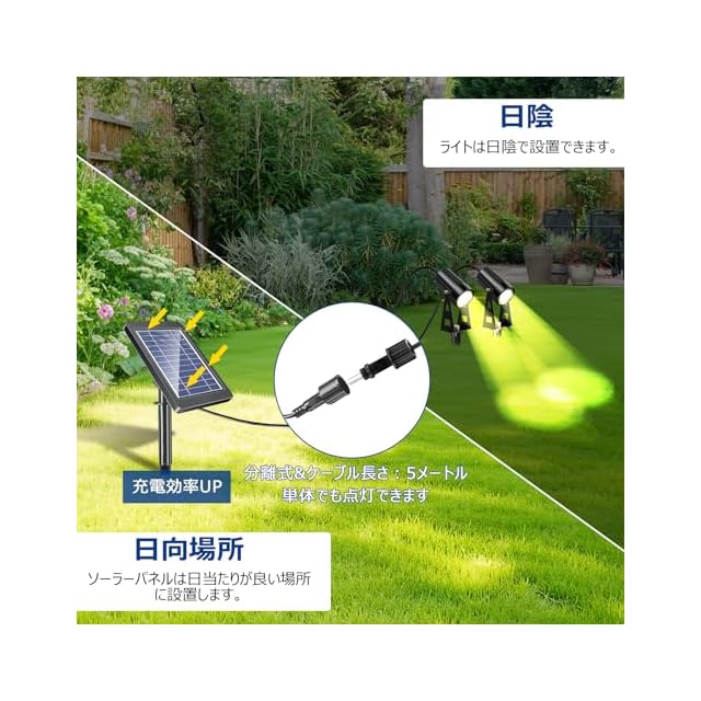 【分離式&超長配線】ソーラーパネルとLEDを自由に設置 ソーラーパネルと照明が分離しており、5m×2本の延長コード付属。日当たりの良い場所にパネルを設置し、ライトは玄関や庭の暗い場所に自由に配置できます。一体型ソーラーライトでは難しい「日陰の照明」も実現!