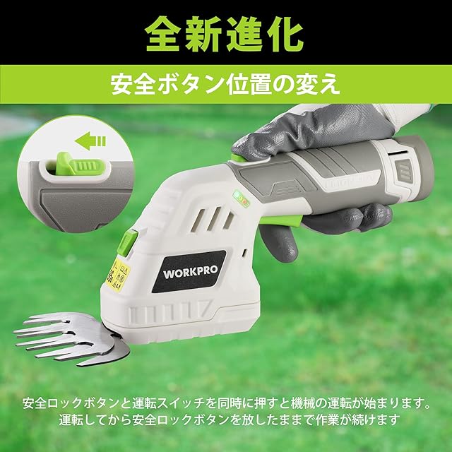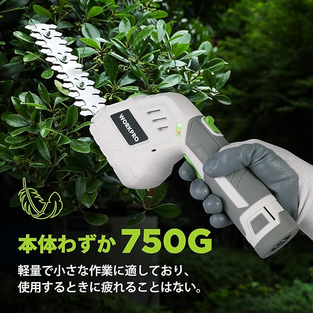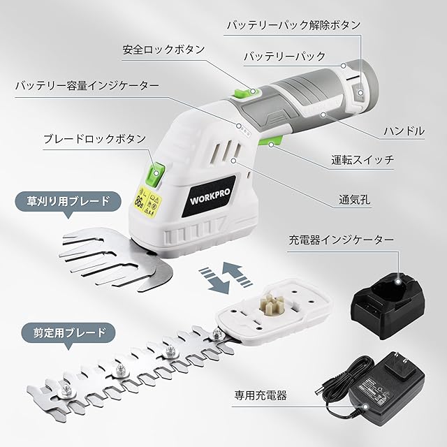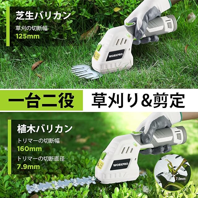 WORKPRO 【2024新型】 芝生バリカン 12V充電式 生垣バリカン 電動芝生バリカン 芝刈り機 一台二役 コードレス 刈込幅125mm 刈込幅160mm 最大切断直径7.7mm ガーデン 植木 剪定 植木 園芸 トリマー バッテリー・充電器・草刈りブレード・剪定ブレード付き