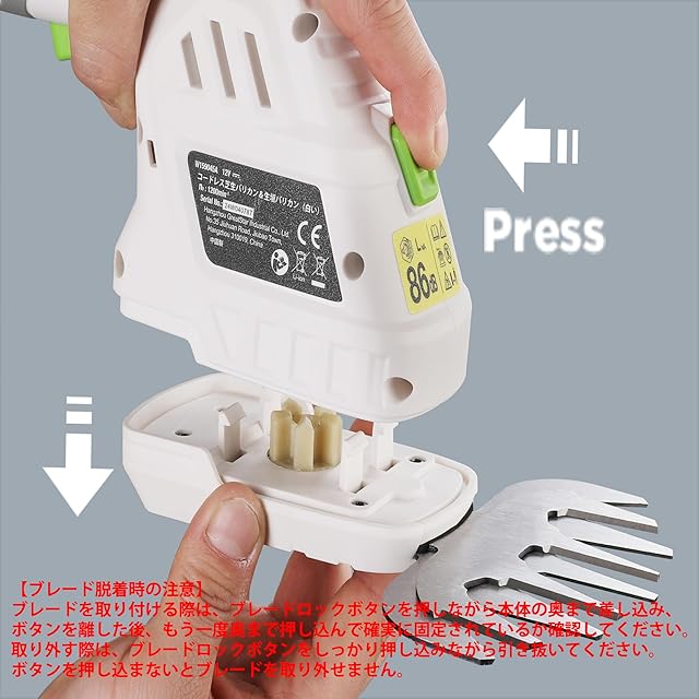 【ブレード脱着のご注意】ブレードを本体に取り付ける際、ブレードロックボタンを押しながら、ブレードを本体の底まで押してブレードロックボタンを放してからもう一度ブレードを押すと底までに着いたかどうか確認します。ブレードを取り外すとき、ブレードロックボタンを底まで押して、ブレードを簡単に取り外せます。ブレードロックボタンを底まで押さないと、ブレードが取れないです。