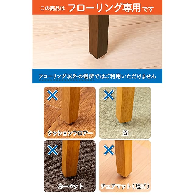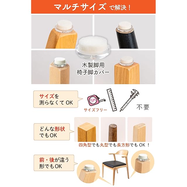 ✅【サイズ選び不要】 木製脚でコインサイズより大きい足ならどんな形状でも取り付け可能。めんどうな採寸作業は不要です。前後の足の形状が違うデザインの椅子にも対応可能です。