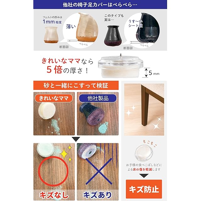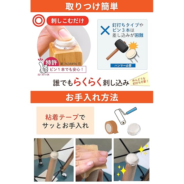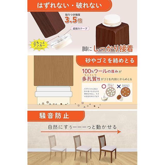 ✅【ぷちっとアンカーでしっかり固定】 特許 第7638496号の固定技術により、椅子脚に強固に食いつき取れにくい構造になっています。 両面テープのみの取付に比べて3.5倍の取付強度になっています。取付け易くしかもしっかり取り付くことにこだわり、数多くの試作を繰り返した結果、短い1本釘を採用しました。