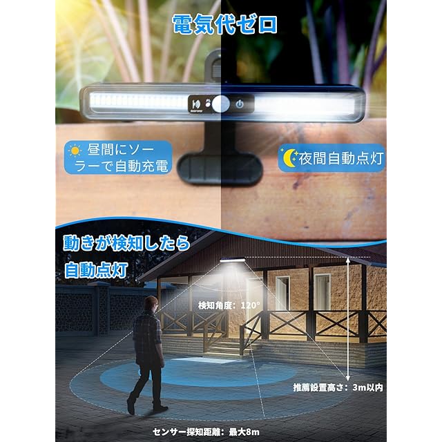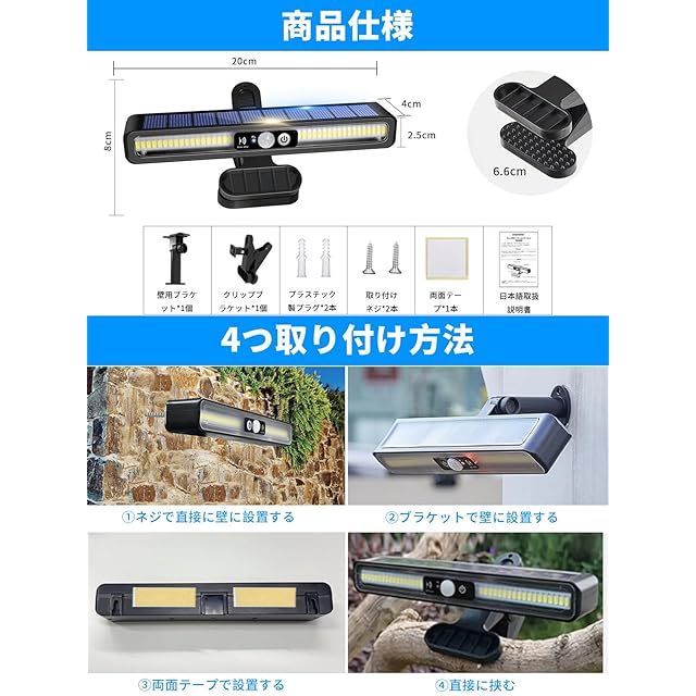 【配線不要・多様設置方法・幅広い用途】ソーラータイプ式のセンサーライトなので、邪魔な配線・取り付け工事は不要、設置の自由度が非常に高い。★クリップブラケット*1個;ネジ*2個;両面テープ*一枚が付属されて、壁に取り付けることだけではなく、物干し竿、キャンプのロップ、椅子などに簡単に挟むことができます。安心に屋外の車道、歩道、庭、軒先、壁掛け、玄関周りなどに設置出来る。キャンプ、ベランダ、カーポート、アウトドアなどにも大活躍、灯りが欲しい場所に挟んですぐ発光、軽作業の照明にも最適!